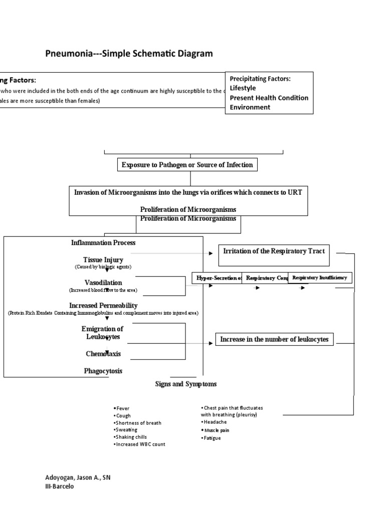 Community acquired pneumonia (cap) can be diagnosed clinically when there are signs of a lower respiratory tract infection and wheezing syndromes have been ruled out. Pathophysiology host defences trigger inflammatory response which lead to clinical syndrome of pneumonia inflammatory mediators from macrophages. Both viral and bacterial pneumonia can spread to others through inhalation of airborne droplets from a sneeze or cough. Impairment is due to primary or acquired immunosuppression, suppression of cough reflex (drugs, virus, coma, anesthesia), injury to mucociliary apparatus (smoking, virus, kartegeners. Pathophysiology & schematic diagrams are useful to better understand a disease condition's processes.